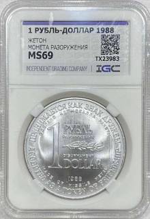 Жетон 1 рубль-доллар 1988 г. "Монета разоружения" в слабе MS-69 продам